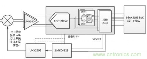在射頻采樣無(wú)線電中,采樣時(shí)鐘的質(zhì)量好壞對(duì)系統(tǒng)產(chǎn)生的信噪比(SNR)具有強(qiáng)烈影響。LMK04828是兼容JESD204B的超低噪音時(shí)鐘抖動(dòng)清除器,可生成小于100fs抖動(dòng)、具有射頻采樣能力的時(shí)鐘,同時(shí)具有一系列收縮或簡(jiǎn)化系統(tǒng)的特性。因支持最多七個(gè)JESD204B裝置,LMK04828可以為多個(gè)ADC32RF45 ADC、數(shù)字模擬轉(zhuǎn)換器(DAC)、FPGA或DSP記時(shí)。LMK04828還可以生成系統(tǒng)參考(SYSREF)信號(hào),用于JESD204B系統(tǒng)中確定性延遲,而數(shù)字和模擬延遲可幫助滿足每個(gè)JESD204B設(shè)備的關(guān)鍵計(jì)時(shí)需求。