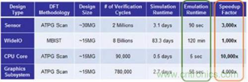 硬件加速仿真的執(zhí)行速度比軟件仿真高出幾個數(shù)量級,而不是小幅增加。在硬件加速仿真中運(yùn)行 DFT 模式時,某些衡量標(biāo)準(zhǔn)提高了四到五個數(shù)量級。參見表 1。