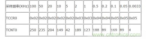 ADC的采樣頻率在上文已有提及,ADC中斷的計算公式為:,通過ATmega16的特殊功能寄存器TCCR0的低3位CS02,CS01,CS00的設置就可以改變的頻率,再把TCNT0設置成不同的數值就可以得到這個系統所需要的各個采樣頻率值了。表1中的數據是通過上面的公式計算出來的數據再經實際的系統調試并修正后的數據。