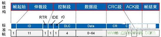 以標準數椐幀為例,從結構上看分成7段,分別為起始段、仲裁段、控制段、數椐段、CRC校驗段、ACK應答段、幀結束段,如圖1所示: