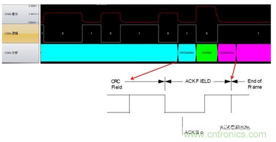 當一個接收節點接收的幀起始到CRC段之間的內容沒發生錯誤時,它將在ACK段發送一個顯性電平。 如圖3所示: