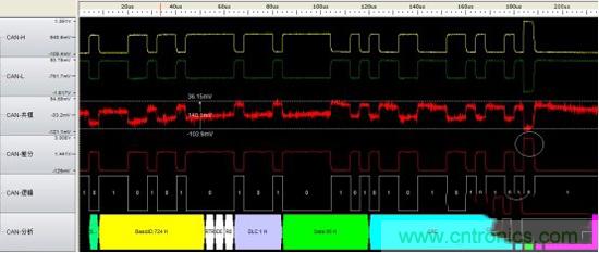 【導讀】CAN總線一直以實時性強、傳輸距離遠、抗干擾能力強、數據保證到達等特點而廣泛應用于高可靠性的場合。但常常在觀察CAN通信波形時,我們會發現差分電平在ACK段突然增高,這是什么原因導致的呢?這里結合測試實例對ACK電平偏高的原因做簡單分析。