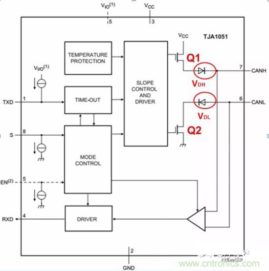 首先,我們看一款CAN收發器的典型內部結構圖,CANH、CANL連接總線。