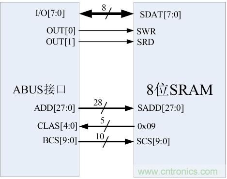 8位SRM模塊與NIOSII通過ABUS(FPGA)連接,實(shí)現(xiàn)正確的時(shí)序讀寫操作。如圖2-5。表5是信號連接說明。