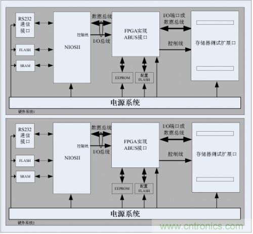 在測試NAND FLASH時(shí),測試時(shí)間長達(dá)十個(gè)小時(shí)不等。在此為提高測試效率,增加測試速度,本設(shè)計(jì)采用兩套完全一樣且獨(dú)立的硬件系統(tǒng)構(gòu)成。可同時(shí)最多測試2片NAND FLASH器件。每一個(gè)硬件系統(tǒng)由一個(gè)微處理器(NIOSII)加一個(gè)大容量FPGA及一個(gè)存儲器測試擴(kuò)展接口(即ABUS接口)三大模塊構(gòu)成。如圖3-1。RS232通信接口實(shí)現(xiàn)測試系統(tǒng)與上位機(jī)的數(shù)據(jù)交換,完成人機(jī)交互操作。電源系統(tǒng)產(chǎn)生各種合適的電壓,滿足各芯片的電源供給。