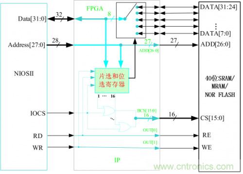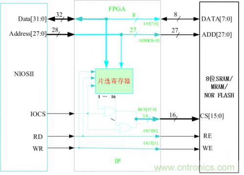 如圖4-2,SRAM、MRAM和NOR FLASH的接口操作基本一致,NIOSII的總線時(shí)序完全滿足。故在FPGA內(nèi)部只要簡單的把相應(yīng)的控制線和數(shù)據(jù)線相連就可以了,唯獨(dú)只要設(shè)計(jì)一個(gè)片選寄存器,用來區(qū)分SIP的16個(gè)片選。每一個(gè)片選可以訪問的空間為128MByte。片選寄存器的地址為(基址+0x0FFFFFFC),基地址設(shè)在NIOSII 外部總線的最高地址位。