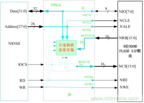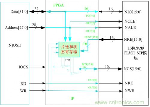 16位的NAND FLASH存儲器芯片可以有多種組合方式,可以用多個(gè)16位的NAND FLASH組合,也可以用多個(gè)8位的NAND FLASH組合。這里我們假設(shè)16位的SIP NAND FLASH產(chǎn)品是由多個(gè)16位的NAND FLASH組合而成,下面的IP核是根據(jù)它的結(jié)構(gòu)來設(shè)計(jì)的。