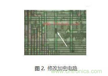 對不同芯片,提供對應的圖紙,讓廠家做電路修改,目的是讓MCU的存儲區(qū)變得可讀。有些MCU默認不允許讀出Flash或者E2PROM中的數(shù)據(jù),因為有硬件電路做保護,而一旦切斷加密連線,程序就暴露可讀了。如圖2所示