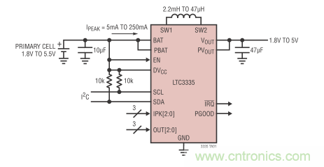 LTC3335 是一款毫微功率高效率同步降壓-升壓型轉換器,內置了精確的庫倫計數器,提供高達 50mA 連續輸出電流。該器件具僅為 680nA 的靜態電流,可編程峰值輸入電流從低至 5mA 直至 250mA,非常適合多種低功率電池應用,例如在可穿戴設備和 IoT 設備中見到的那些應用。其 1.8V 至 5.5V 輸入電壓范圍和 8 個 1.8V 至 5V 的用戶可選輸出允許在輸入電壓高于、低于或等于輸出電壓時,提供穩定的輸出電源。此外,該器件集成的精確 (±5% 電池放電測量準確度) 庫倫計數器可在長壽命不可再充電的電池供電應用中,對累積電池放電提供準確監視,這類應用在很多情況下具極其平坦的電池放電曲線。典型應用包括無線傳感器、遠程監視器和ADI的 Dust Networks SmartMesh系統。LTC3335 包含 4 個內部低 RDSON MOSFET,可提供高達 90% 的效率。其他特點包括一個可編程放電報警門限、一個用于存取庫倫計數值和器件設定的 I2C 接口、一個電源良好輸出和 8 個 5mA 至 250mA 的可選峰值輸入電流以適合多種類型和尺寸的電池。采用耐熱增強型 20 引線 3mm x 4mm QFN 封裝的 LTC3335 的工作結溫范圍為 -40°C 至 +125°C。圖 2 顯示了 LTC3335 的典型應用電路。