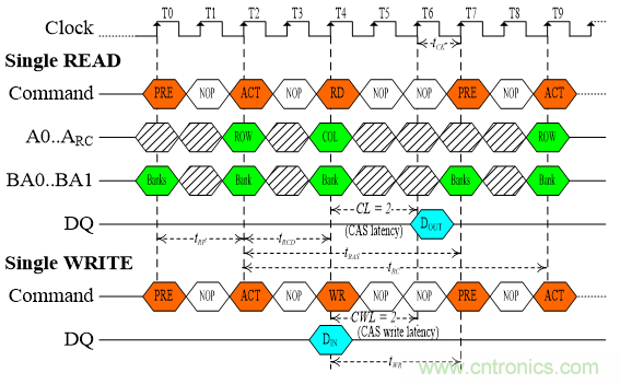 圖中,頻率時(shí)間(tCK)是從此次頻率邊緣至下次頻率邊緣為止的時(shí)間。列地址選通預(yù)充電時(shí)間(tRP)是從PRE命令至ACT命令為止的時(shí)間。列地址選通至行地址選通延遲(tRCD)是從ACT命令至RD命令或WR命令為止的時(shí)間。行地址選通潛伏(CL)是從RD命令開始等候一段時(shí)間,并且以tCK為基本單位,然后乘上倍數(shù)。寫入時(shí)間(tWR)是從WR命令至PRE命令為止的時(shí)間;另外還可以tCK為基本單位,然后乘上倍數(shù),如同行地址選通潛伏的計(jì)時(shí)方法,因此命名為行地址選通寫入潛伏(CWL)。列地址選通時(shí)間(tRAS)是從ACT命令至PRE命令為止的時(shí)間。更新命令時(shí)期(tRC)是從這次ACT命令至下次ACT命令為止的時(shí)間。