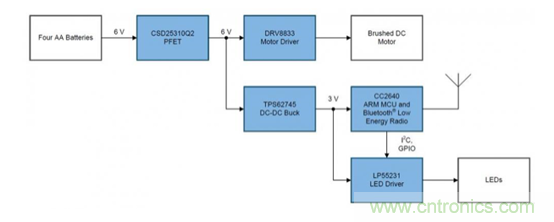 電機(jī)驅(qū)動(dòng)器:驅(qū)動(dòng)電流、電源電壓范圍、負(fù)載電機(jī)類(lèi)型和安全關(guān)閉功能都是選擇電機(jī)驅(qū)動(dòng)器時(shí)的因素。DRV8833可以驅(qū)動(dòng)多種類(lèi)型的電機(jī)和感性負(fù)載,峰值電流為2A,電源電壓范圍為2.7V至10.8V,非常適合使用四節(jié)AA電池。標(biāo)稱(chēng)驅(qū)動(dòng)電壓電池的電壓是5V。