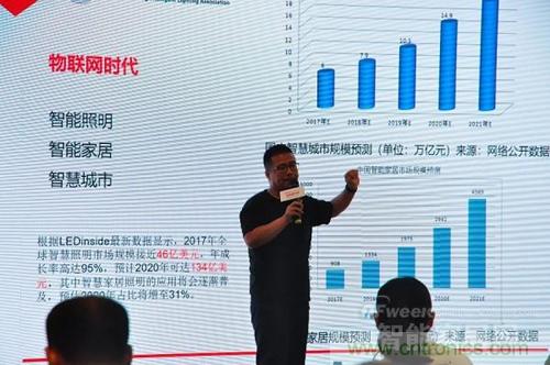 上海浦東智能照明聯合會秘書長代照亮則為現場觀眾帶來了物聯網時代智能照明領域的最新進展。根據最新數據顯示,2017年全球智慧照明市場規模接近46億美元,年成長率高達95%,預計2020年可達134億美元,其中智慧家居照明的應用將會逐漸普及,預估2020年占比將增至31%。