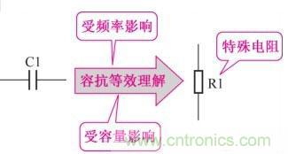 根據上述內容可以將電容等效成一個“電阻”(當然是一個受頻率高低、容量大小影響的特殊電阻),如圖1-30所示,這時可以用分析電阻電路的一套方法來理解電容電路的工作原理,這是電路分析中常用的等效理解方法。等效理解的目的是為了方便電路分析和對工作原理的理解。