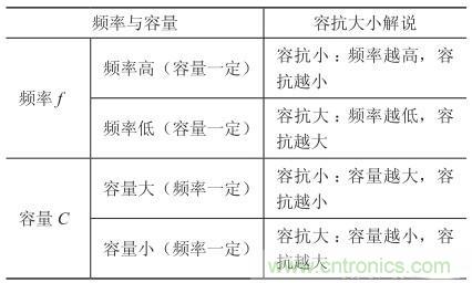 表1-2給出了容抗、頻率、容量三者之間關系的小結。