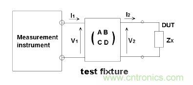 射頻電感電感量測量的原理圖如上,對于測試夾具的殘留因素和離散因素對測量系統的影響,行業的通用做法是用下面所示的F參數來描述: