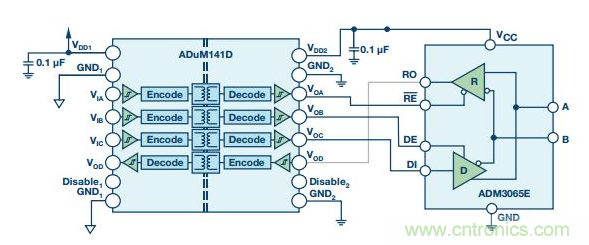 RS-485信號傳輸是平衡的差分式傳輸,本身便能抗干擾。系統噪聲均等地耦合到RS-485雙絞線電纜中的每條導線。一個信號的發射與另一個信號相反,耦合到RS-485總線的電磁場彼此抵消。這降低了系統的電磁干擾(EMI)。此外,ADM3065E增強的2.1 V驅動強度支持在通信中實現更高的信噪比(SNR)。給ADM3065E增加信號隔離可利用ADuM141D 輕松實現。