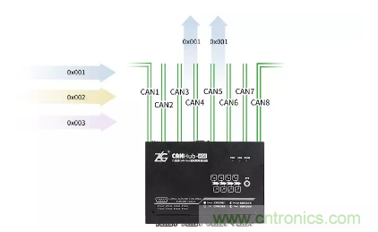 方法三:使用CAN轉換器或接口類產品輔助排查。簡單的故障排查一般我們采用USBCAN卡解決,通過抓取總線上的報文分析故障節點。極端情況下,一個故障節點往往能直接拖垮一個總線,總線上將無任何數據,此時怎么通過抓取報文解決問題呢?通過一個多路的CAN集線器能解決以上問題。CAN集線器的每個CAN接口都是一個獨立的CAN節點,一路CAN的嚴重故障不會導致所有節點不能進行數據收發,此時不能正常發出數據的節點可判定為故障節點。
