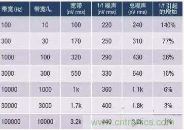 表1:1/f 噪聲影響與電路帶寬的關系示例