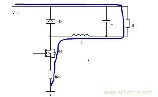 接下來的開關周期內,電感通過二極管D續流,如圖3所示。這就出現了一個問題,此時的電流不再流經開關管,控制電路無法知道電流下降到何種程度了。
