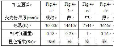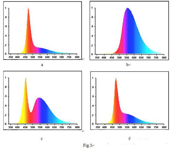我們?cè)鴮?duì)此進(jìn)行了實(shí)驗(yàn)研究,我們利用某公司生產(chǎn)的1W高亮度藍(lán)光LED,其光譜的中心輻射波長為470nm見Fig.3,去除外封裝后分別涂敷不同厚度的輻射的中心波長為560nm的黃光熒光粉涂層,經(jīng)處理后測量其發(fā)射光譜。從二十余種不同厚度的樣品中選擇了四種典型情況,其結(jié)果見Fig