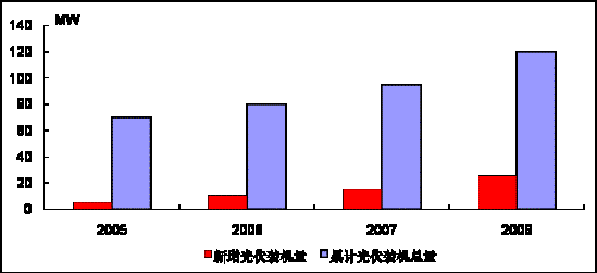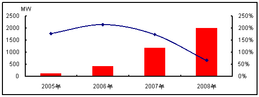 圖 2 2005-2008年中國(guó)太陽(yáng)能電池裝機(jī)量