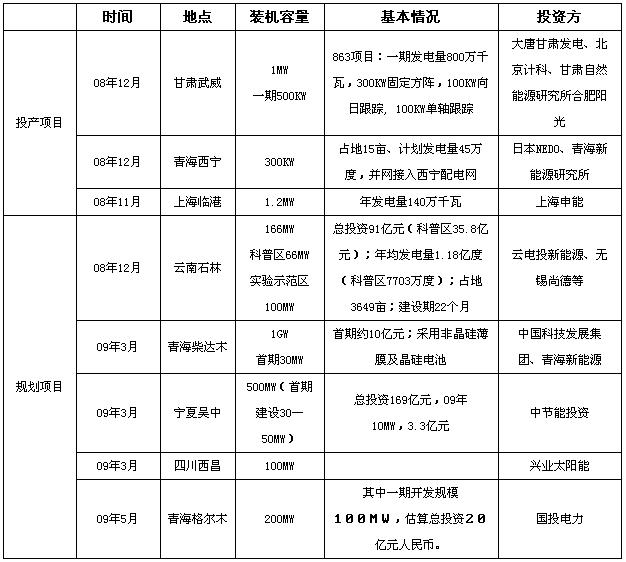 受國(guó)家政策的導(dǎo)向,從2008年底到2009年上半年,全國(guó)上馬了多個(gè)大型并網(wǎng)電站項(xiàng)目,如青海柴達(dá)木的1GW光伏電站項(xiàng)目、青海格爾木的 200MW光伏電站項(xiàng)目、寧夏吳中的500MW光伏電站項(xiàng)目等,盡管目前國(guó)家只批準(zhǔn)了三個(gè)光伏電站項(xiàng)目包括上海崇明島1MW項(xiàng)目、255千瓦的內(nèi)蒙古鄂爾多斯項(xiàng)目和甘肅敦煌的100MW項(xiàng)目,而以上新上馬的項(xiàng)目還有待國(guó)家的批復(fù)。