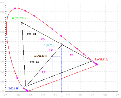 也就是CW的距離與C成反比,即混合色中C所占的比重越大,CW的距離越短,這就和白燈制作時大家的經驗一樣,熒光粉的量越多,光色越偏黃(即CW越短)。