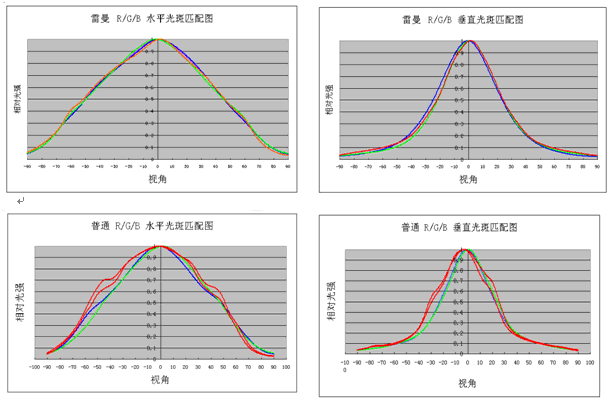 前兩幅圖是雷曼光電自行研制產品的配光效果,后兩幅是以前用公模的產品的配光效果,從圖中可以看出,原來公模的產品在50度角度左右可能會偏紅,要調整到比較理想的效果比較困難。雷曼光電自行研制的產品考慮到了客戶的這種需求,在左右90度的三種顏色的配光都較為理想,這就為顯示屏的白平衡調節提供了強有力的支持。