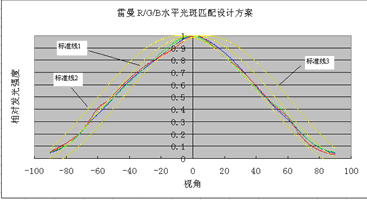 壓在三條標準線之間的是我們雷曼R/G/B的光強分布曲線,從圖中可以看出,我們的產品設計是能夠滿足高品質顯示屏需求的。