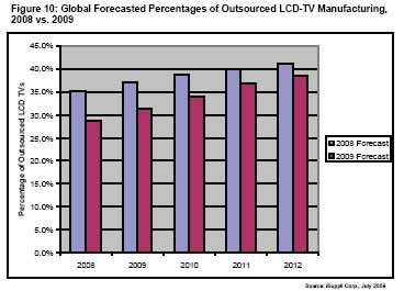 iSuppli早先預(yù)計2008年35.2%的LCD-TV將外包給合同制造商,但結(jié)果是外包出去的LCD-TV僅占28.7%。
