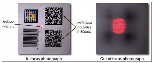 Bokode設(shè)計從角度來形成及解讀信息,這使得標(biāo)準(zhǔn)相機(jī)看世界的方法和人眼迥異,并可以從遠(yuǎn)距偵識出物體的身份及和光學(xué)標(biāo)簽的相對角度。因為Bokode它讓使用者可以從很遠(yuǎn)的地方利用現(xiàn)有設(shè)備讀取信息,因此較傳統(tǒng)條形碼更有用,彈性更大。
