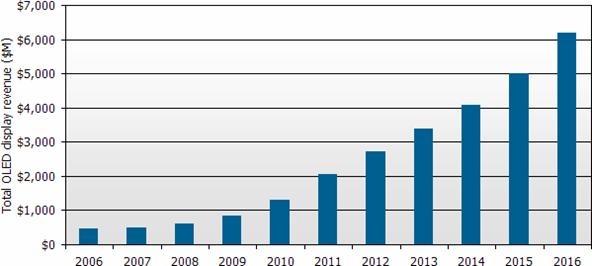 “根據(jù)DisplaySearch最新發(fā)表季度OLED(有機(jī)發(fā)光二極管顯示器)出貨報(bào)告指出,第二季全球OLED出貨金額創(chuàng)新高達(dá)1億9千2百萬(wàn)美元,較上一季成長(zhǎng)32%,與去年同期相比成長(zhǎng)22%。DisplaySearch預(yù)測(cè)全球OLED產(chǎn)值將從2008年6億美元,按每年33%復(fù)合成長(zhǎng)率成長(zhǎng),估計(jì)到了2016年整體產(chǎn)值將達(dá)到62億美元;其中手機(jī)主屏仍是最主要的應(yīng)用,2016年出貨金額估計(jì)為30億美元,同時(shí)OLED TV產(chǎn)值將達(dá)20億美元,成為OLED第二大應(yīng)用產(chǎn)品。