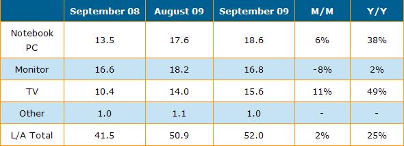盡管桌上型液晶顯示器面板出貨較上月下滑8%,出貨量?jī)H為1千6百萬片,同時(shí)這也是桌上型液晶顯示器用面板出貨自今年2月份以來首次呈現(xiàn)下滑狀態(tài),然而全球大尺寸液晶面板仍較上月增長(zhǎng)。9月份三星(Samsung)在可攜式電腦(包括筆記本電腦與上網(wǎng)本)用面板方面出貨總數(shù)超過5百萬片,這也是首次單月份可攜式電腦用面板出貨最高紀(jì)錄。