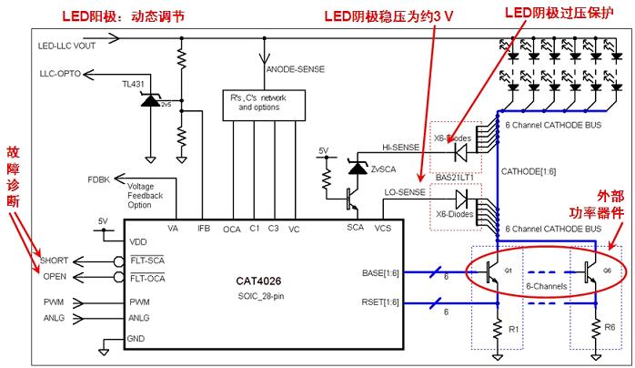 其它應(yīng)用,如建筑物照明中,同樣可以采用安森美半導(dǎo)體的高能效LED驅(qū)動方案,如CAT4103、CAT4109三通道線性恒流驅(qū)動器是高亮度RGB LED驅(qū)動器,應(yīng)用于新興的高亮度、高視覺沖擊力LED建筑物照明中的RGB LED像素控制。而CAT4106是多通道升壓型LED驅(qū)動器,適合較大尺寸的通用LCD背光應(yīng)用,能夠驅(qū)動多達(dá)40個白光LED,提供總計達(dá)6 W的LED輸出功率,并幫助設(shè)計人員提升背光能效至最高。此外,采用LED背光的大尺寸液晶電視日趨多,其中尤以側(cè)光式LED背光為主,通常需要采用6個單串的LED光條(每串LED視為一個LED道)。現(xiàn)有6通道側(cè)光式LED電視中每個LED通道均含有專用驅(qū)動器IC、電感型DC-DC升壓轉(zhuǎn)換器及及開關(guān)。而安森美半導(dǎo)體應(yīng)用于大尺寸側(cè)光式LED背光液晶電視的多通道線性LED驅(qū)動器CAT4026是一種高性價比方案,支持高數(shù)量的通道,能以單顆IC控制6個LED通道,能效目標(biāo)范圍高于90%,能效典型值量多達(dá)94%,且針對 LED開路和過多LED短路等故障條件提供保護(hù)。CAT4026的簡略應(yīng)用示意圖參見圖2。