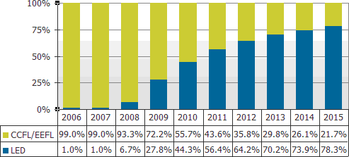 圖一 2006-2015採用傳統CCFL&EEFL燈管與LED背光大尺寸液晶面板出貨比率預測