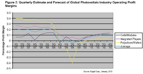 iSuppli 公司的分析結果顯示,繼2009 年大部分時間虧損之后,廠商在第四季度恢復盈利。預計2010 年獲利情況將繼續改善,但不會回升到經濟衰退之前的水平。iSuppli 公司預測,光伏產業多數領域的平均利潤率將在2010 年第四季度前回升到10%以上。但是,供應過剩的多晶硅領域的扭虧步伐將落在后面。驅動降低成本計劃盈利情況改善的主要因素,是追上價格下跌的速度。