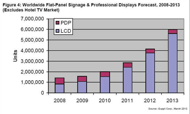 在今年出貨的將近大約200萬塊數(shù)字標(biāo)牌和專業(yè)顯示器中,整整四分之三,即152萬塊將是液晶顯示器,其它的468752塊是等離子顯示器。
