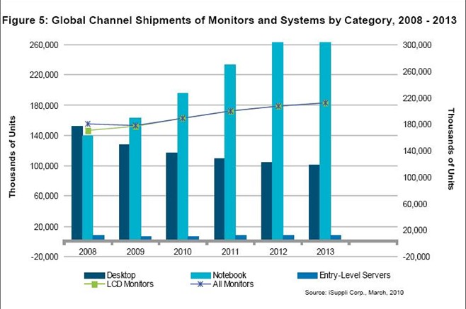 在景氣低迷時期的大部分時間里,顯示器的消費(fèi)需求實(shí)際上強(qiáng)于企業(yè)需求,因?yàn)槠髽I(yè)在此期間為了削減成本而裁員和大砍設(shè)備支出。2010年及以后,形勢將會發(fā)生轉(zhuǎn)變,企業(yè)客戶將扮演更重要的角色。