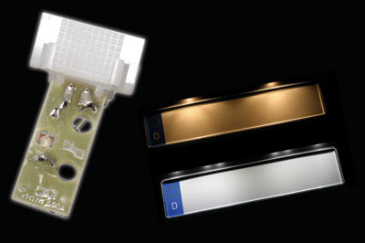 圖2所描述的是兩個(gè)汽車牌照照明的例子。一個(gè)例子描述了兩個(gè)獨(dú)立、無(wú)導(dǎo)光的光源無(wú)法完全照亮汽車牌照,而是留有暗區(qū);另一個(gè)則描述了使用導(dǎo)光管制造的光幕可以更加均勻地照亮牌照。采用光幕的方式可以取得更好的照明效果,而僅需要很低的電流和很細(xì)的導(dǎo)線用來(lái)承載這些電流,并取得顏色和照明的更多一致性,更不需要燈泡。
