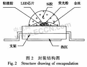 Si襯底的功率型GaN基LED封裝采用仿流明的支架封裝形式,其外形有朗柏型、矩形和雙翼型。其制作過程為:使用導熱系數較高的194合金金屬支架,先將LED芯片粘接在金屬支架的反光杯底部,再通過鍵合工藝將金屬引線連接LED芯片與金屬支架電極,完成電氣連接,最后用有機封裝材料(如Si膠)覆蓋芯片和電極引線,形成封裝保護和光學通道。這種封裝對于取光效率、散熱性能、加大工作電流密度的設計都是最佳的。其主要特點包括:熱阻低(小于10℃/W),可靠性高,封裝內部填充穩定的柔性膠凝體,在-40~120℃范圍,不會因溫度驟變產生的內應力,使金絲與支架斷開,并防止有機封裝材料變黃,引線框架也不會因氧化而沾污;優化的封裝結構設計使光學效率、外量子效率性能優異,其結構見圖2。