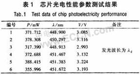通過優化Si襯底表面的處理和緩沖層結構,成功生長出可用于大功率芯片的外延材料。采用Pt電極作為反射鏡,成功實現大功率芯片的薄膜轉移。采用銀作為反射鏡,大大提高了反射效率,通過改進反射鏡的設計并引入粗化技術,提高了光輸出功率。改進了Ag反射鏡蒸鍍前p型GaN表面的清洗工藝和晶片焊接工藝,改善了銀反射鏡的歐姆接觸,量子阱前引入緩沖結構,提高了芯片發光效率,優化量子阱/壘界面生長工藝,發光效率進一步提高,通過改進焊接技術,減少了襯底轉移過程中芯片裂紋問題,芯片制備的良率大幅度提高,且可靠性獲得改善。通過上述多項技術的應用和改進,成功制備出尺寸1mm×1mm,350mA下光輸出功率大于380mW的藍色發光芯片,發光波長451nm,工作電壓3.2V,完成課題規定的指標。表1為芯片光電性能參數測試結果。