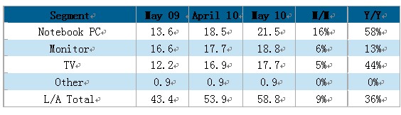 根據DisplaySearch月度TFTLCD出貨報告數據,2010年5月大尺寸TFT LCD面板出貨量達五千八百八十萬片,較四月增長9%,相應出貨金額為七十五億美金,較四月增長7%,這個數據也超越了今年3月剛創下最高月出貨量紀錄。不只如此,與去年相比較增長幅度顯著提高,出貨量增36%,出貨金額更是增長60%。