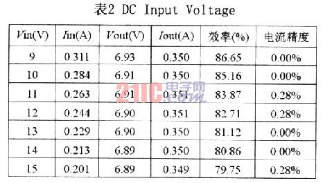 表2為輸入用直流電源,電壓范圍9~15V,從表中可以看出Iout幾乎不因輸入電壓不同而變動,效率為79.75~86.65%,電流精確度0.00~0.28%。(表2的數值是用1WLED量測)
