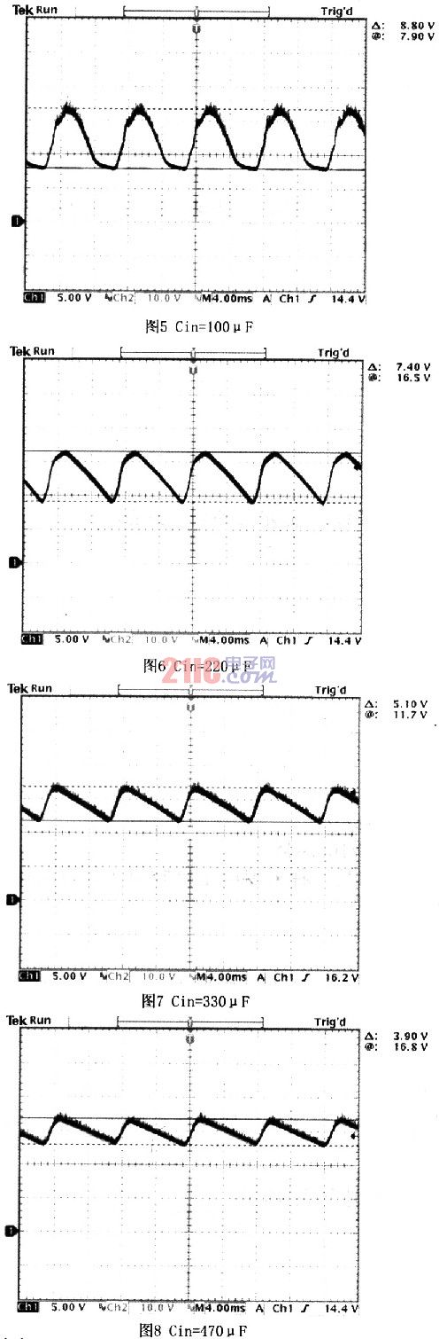 圖5~圖8列出了在不同輸入電容值情況下,輸入紋波Vin:CHl與SW:CH2的變化情形,輸入電容值越大輸入電壓紋波越小,圖5中因為紋波太大,造成Vin最小值剛好等于LED導通電壓,這時候PWM全開,如果電容更小時LED導通電壓不足,造成LED會無法發亮,圖8中電容用330μF就能讓輸入電壓不會過低。(串聯3顆1WLED)
