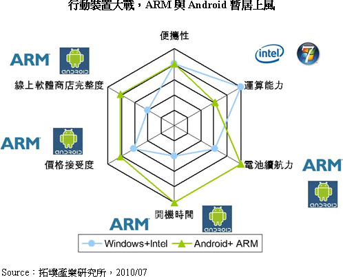 今年在智慧型手機(jī)作業(yè)系統(tǒng)及處理器都沒有發(fā)表新版本的情形下,2010年第二季智慧型手機(jī)較去年同期成長(zhǎng)了43%,采用ARM處理器與Apple作業(yè)系統(tǒng)的iPad以每月出貨100萬(wàn)臺(tái)的速度快速成長(zhǎng)。而搭載Intel Capella新平臺(tái)及Windows 7的NB出貨量雖然也表現(xiàn)不惡,但第二季的年成長(zhǎng)率只有32%,兩者潛力高下立判。