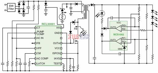 1)基于NCL30001的電流可調節恒流功率因數校正區域照明LED電源有些區域照明應用場合要求提供帶輸入功率因數校正的隔離型穩壓輸出電壓。這些應用通常采用兩段式的電源轉換架構,其中的升壓功率因數校正(PFC)將交流輸入線路電壓轉換及預穩壓為直流400V電壓,然后提供電壓給可以是任何適當拓撲結構的常規直流-直流(DC-DC)轉換器(功率不超過150W的應用中通常是反激轉換器)。