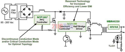 2)基于NCP1607和NCP1397的超高能效大功率LED街燈電源方案近年來,業界對超高能效的LED照明拓撲結構興趣日濃,期望在功率電平相對較低(<50W)時提供高于90%的能效,這個能效目標甚至比“能源之星”2.0版外部電源能效要求(功率不超過49W時能效高于87%)更高。要達到這樣高的能效,需要采用新的拓撲結構,如從反激拓撲結構轉向諧振半橋拓撲結構,從而充分發揮零電壓開關(ZVS)的優勢。有利的是,安森美半導體早已著手開發能用于LED驅動電源的高能效半橋解決方案,如NCP1396及其升級版NCP1397高性能諧振模式控制器。NCP1397內置高端和低端驅動器,支持可調節及精確的最低頻率,提供極高能效,并具備多種故障保護特性。基于NCP1607PFC控制器和NCP1397雙電感加單電容(LLC)半橋諧振控制器的LED電源方案(見圖2)非常適合功率在50到300W范圍的高能效LED街道照明應用。[page]