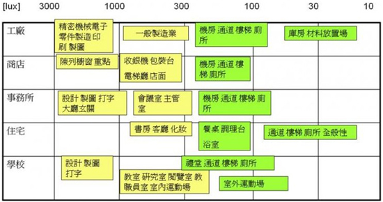 (3)非工作場合--如車站、機場、醫院、大樓大廳、病房、走廊、樓梯間、廁所,則100-300Lux即可。公園、停車場、與街道則可以低到10-50Lux。