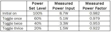 EZdimming偵測wallswitch切換次數,來改變調光準位。自全亮開始,循序降到六分亮,四分亮,二分亮。并且在任何調光階段,都維持高于0.90的功因、高于80%的效率。切換柔和,完全沒有突波電流或噪音的現象。線路精簡,幾乎是零增加硬體成本。
