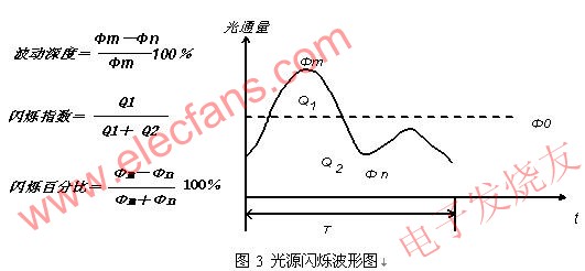 表征光源閃爍強度的參數波動深度、閃爍指數、閃爍百分比,圖3為典型閃爍波形。圖中,Φm為閃爍波峰值,Φn為閃爍波谷值,Φ0為平均光通量,Q1為Φ0以上部分曲線下的面積,Q2為Φ0以下部分曲線下的面積,T為周期。